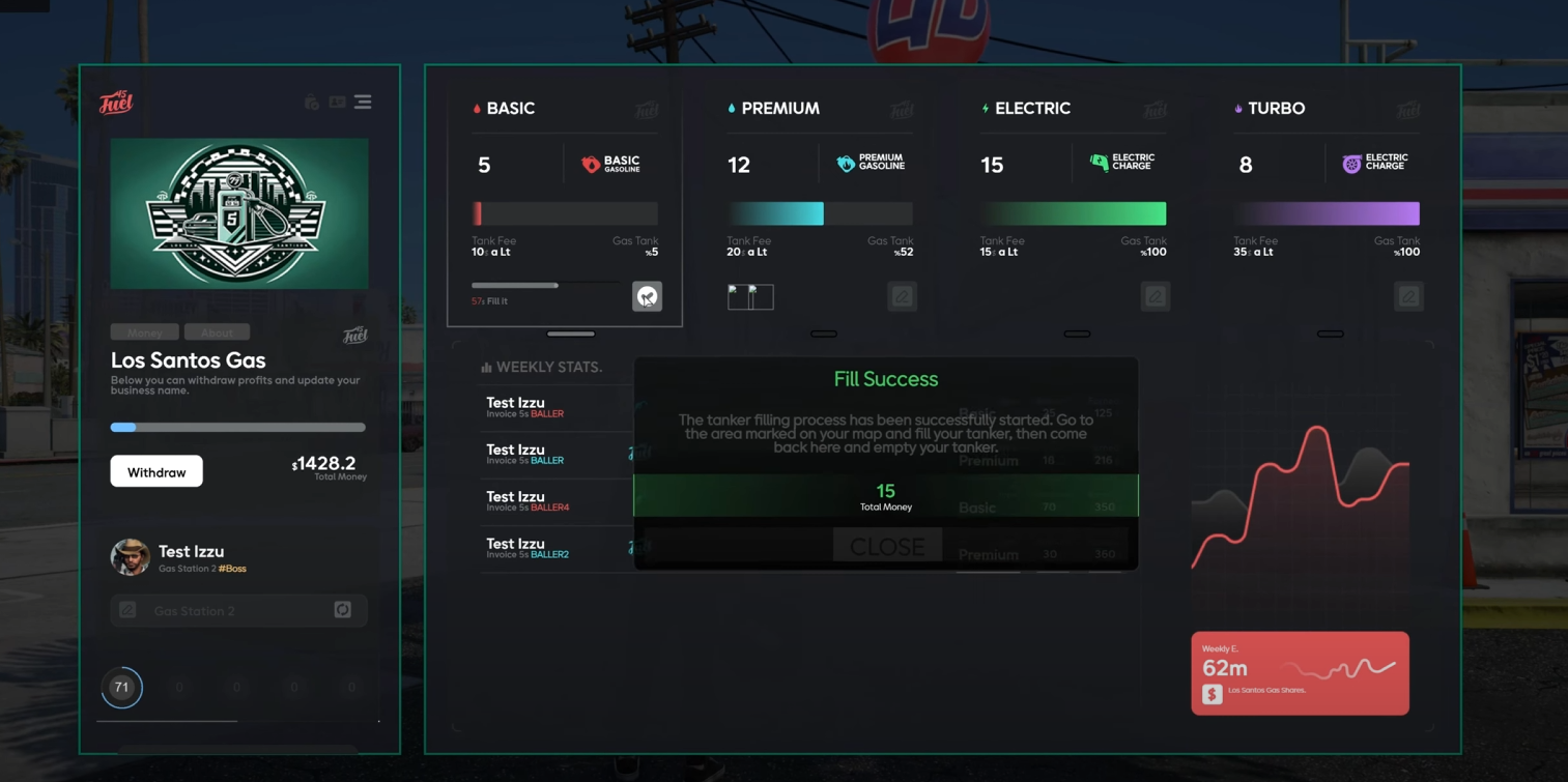 Interesting fact, we were the first developers to create and release owned gas stations for fivem, we did this many years ago!!! Your players can purchase any of the fuel stations around the city! allowing them to run them as a business. Every time another player uses the fuel station, the level of fuel will get lower. Once the fuel level runs out players can no longer purchase gas. Business owners can refill there tanks and purchase large storage tanks for additional storage, along with hire workers and many more things. Check out the full video showcase here!
