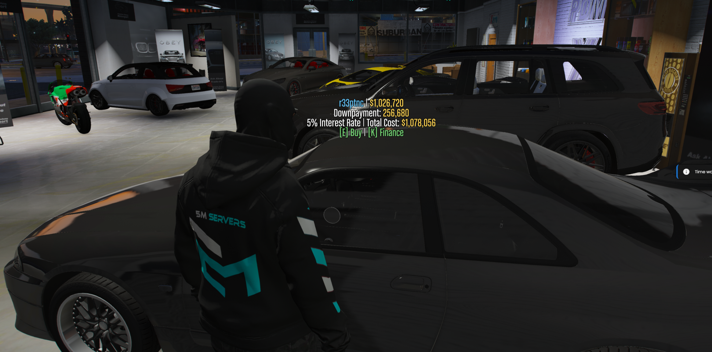 The server comes with our player owned dealership script, this allows car salesman to easily change the vehicles on display in game and on the go! a great tool for roleplay car sales with customers! Check out the full video here